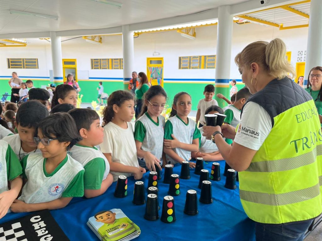Com idades entre seis e dez anos e sede de conhecimento, os alunos da escola municipal José Carlos Martins Mestrinho, no bairro Adrianópolis, zona Centro-Sul, receberam, nesta terça-feira, 21/10, a equipe de Educação de Trânsito da Prefeitura de Manaus, por meio do Instituto Municipal de Mobilidade Urbana (IMMU), para uma bate-papo descontraído e cheio de curiosidades sobre segurança no trânsito.